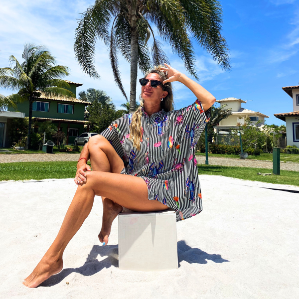 Pode ser usada aberta com biquíni, fechada com shorts ou até como saída — cada forma de vestir revela um novo estilo, sempre com a essência criativa da Kenia.