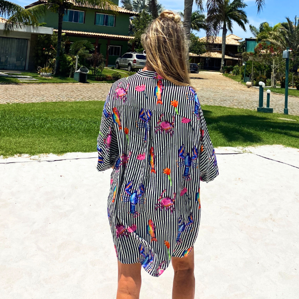 Com listras finas em preto e branco, ela traz um toque sofisticado e atemporal, enquanto as estampas de lagostas, flores e peixes coloridos transformam o visual em uma explosão de alegria e movimento.