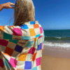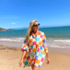 O design apresenta uma estampa exclusiva com blocos coloridos e detalhes de peixes, criando um visual vibrante e moderno. Sua modelagem ampla garante liberdade de movimentos e veste confortavelmente até o tamanho GG, adaptando-se a diferentes corpos sem perder elegância.