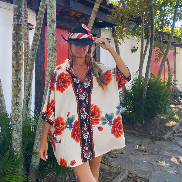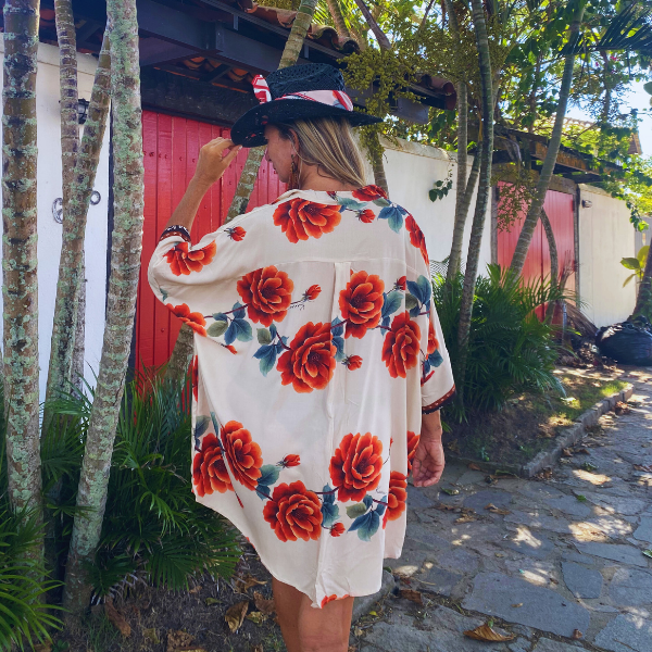 Da praia ao pós-praia, combinada com canga, short ou calça, ela se adapta aos momentos sem perder identidade. A estampa floral carrega a alma da marca, enquanto os botões personalizados com a marca Rosas do Tempo, registrada, reafirmam nosso compromisso de estar presentes em cada detalhe da criação.